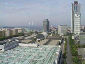 Passata una costellazione di svincoli a più piani siamo in dirittura di albergo. L'albergo è giusto a fianco dell'imponente Intex, sede della grande esposizione. Siamo sulla baia nella zona industriale del porto. Dal ventesimo piano del nostro Hotel dominiamo un paesaggio di canali, navi mercantili grattacieli di cinquanta e passa e cantieri.