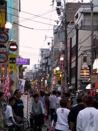 E' il quartiere alternativo a giudicare dagli abbigliamenti che vanno dal neo-metallico piercing e chioma alla Gengis Kaan al più comune street-ware di matrice hip-hop ma più virata verso il dijeismo da club. Del resto non sono stati pochi i dj giapponesi ad imporsi nel panorama internazionale. Entriamo in un negozio pieno zeppo di chitarre usate vecchissime. Da lasciarci il cuore. Ma anche tutte le risorse visto che i prezzi sono davvero alti. Dentro è l'inferno, ognuno può prendere una chitarra o un basso e suonarci quello che vuole al volume che vuole. Fare i commessi lì dentro supponiamo che equivalga al conseguimento del decimo dan in qualche disciplina zen.