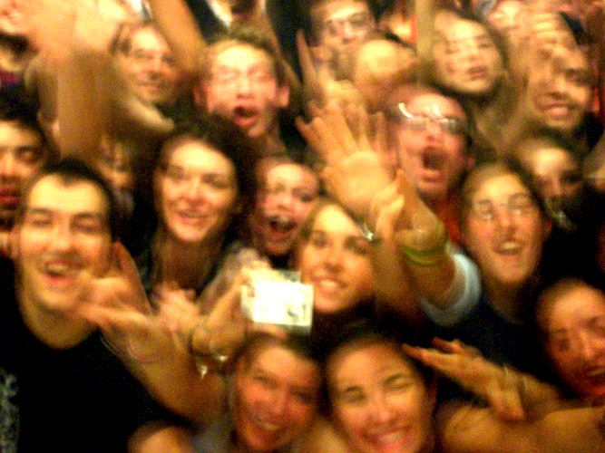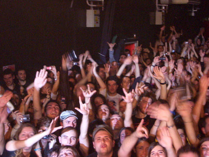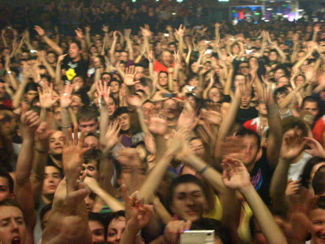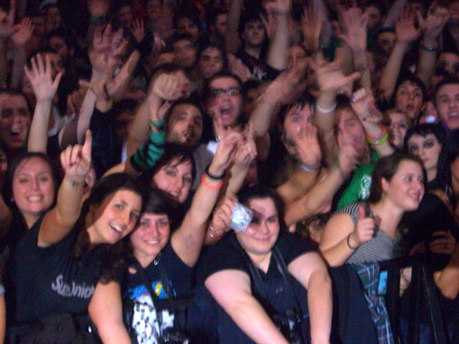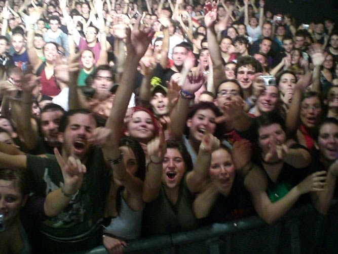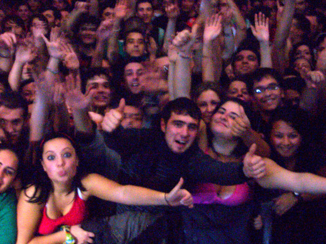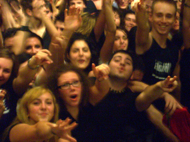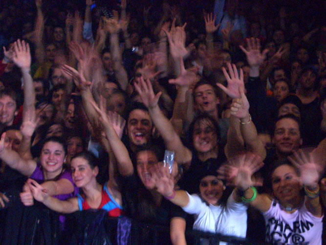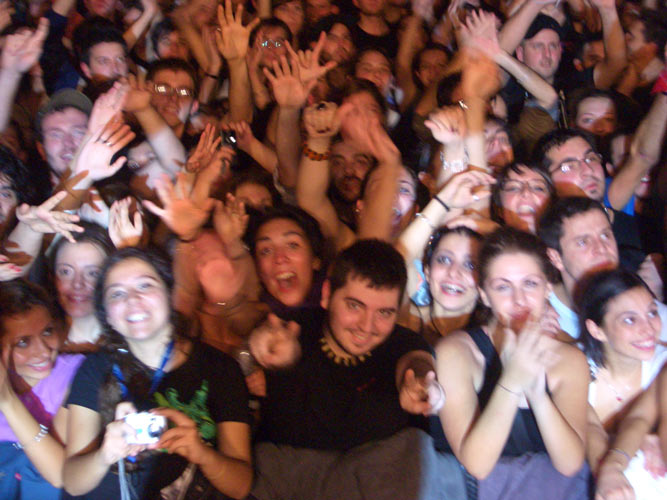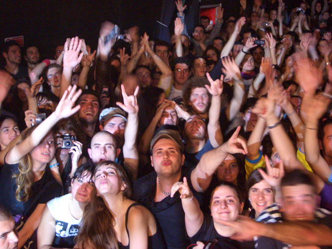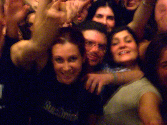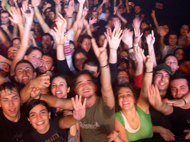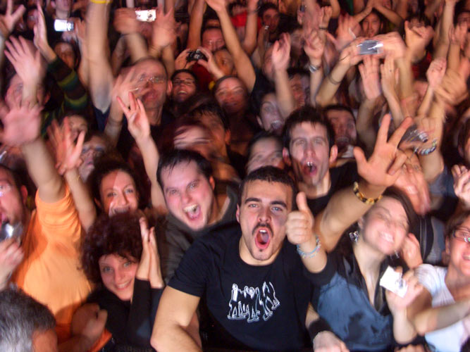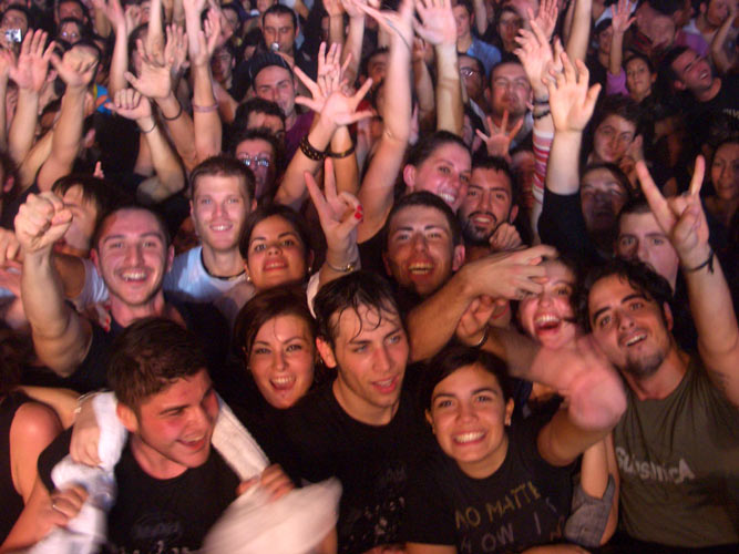 Salire sul palco in queste condizioni non è il massimo (anche se il Ninja ci riuscì quasi moribondo, anni fa), ma il Viper è una bolgia fumante di 1300 anime e l’adrenalina sale subito alle stelle. Starnutisco, mi soffio il naso in continuazione –con i fazzoletti forniti da un più che mai prezioso Tony- , ma mi rendo conto che stiamo facendo un concerto strepitoso. Certo, le gambe sono più molli del solito e saltare è proprio faticoso, ma i miei 4 soci filano come siluri e tutto si incastra alla perfezione. Samu canta un finale di Strade da brivido e quando va così…oh yeah, sappiamo che la serata sarà spettacolare. È difficile descrivere i miliardi di emozioni e di pensieri che ti affollano la mente durante un concerto: si va dalla matematica che regola un beat in sedicesimi, alla pura vibrazione interiore (presente un orgasmo?), passando per schizzi di immagine da fase REM. In serate come questa, il pubblico catalizza totalmente la mia attenzione e traggo linfa vitale da ogni salto, pogo, lacrimuccia e urlo, questo splendido reality show che ci viene regalato minuto dopo minuto.