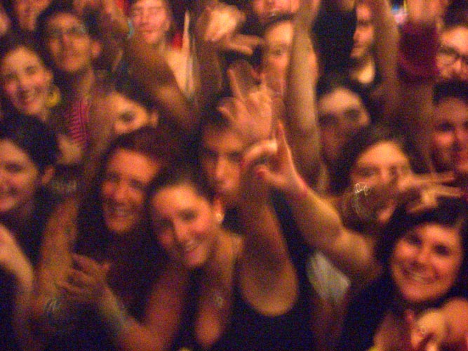 Ci accorgiamo tra l’altro che qualcuno ieri sera si è bellamente fottuto una camicia fluo, la mia. Casca a fagiolo un ragazzo, che ci regala,poco prima di iniziare, qualche maglietta “promozionale” – ce n’è una bianca, decorata con un woofer, che fa proprio al caso mio.