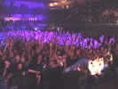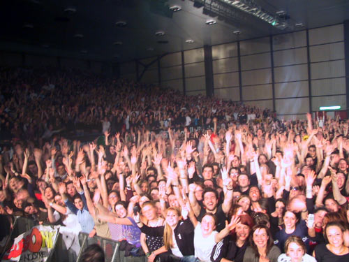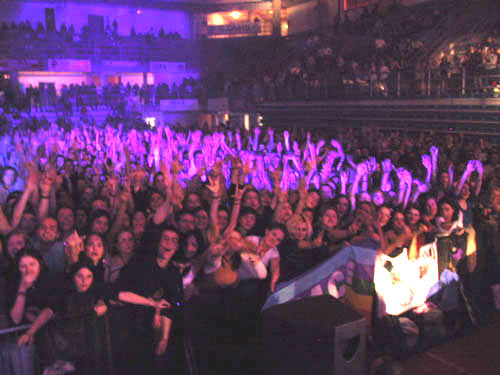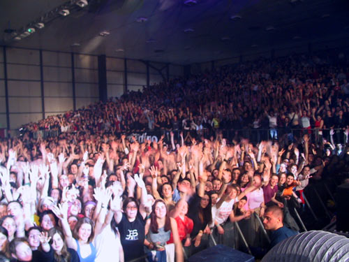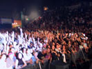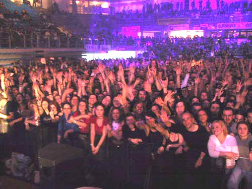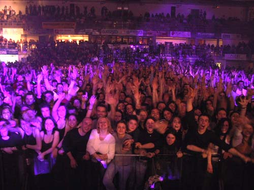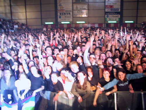 Comunque tutte queste conoscenze faranno da padrini per il varo della tourneè. In camerino c'è allegria mentre il palasport si riempie di circa tremila persone. Duemila biglietti sono già stati venduti in prevendita. Massive Attack come sottofondo, buio, sigla iniziale di disturbitecnologici-scoppiettii di cellulari-modem-fax... insomma tutta una intro delicata delicata su cui la gente però urla battendo le mani a tempo. Vabbè poco male, vuole dire che l'attesa è tanta. Il pubblico probabilmente si aspetta un brano coi botti per l'inizio, e noi invece partiamo con "Livido Amniotico" ancora più rarefatta e lenta dell'originale. Nonostante ciò tra le prime file c'è chi incomincia a ballare quasi pogando. "Il cielo su Torino" a seguire, mentre Cipo tenta di dare gli ultimi ritocchi al suono e poi si passa a brani decisamente più energici. Il concerto viene seguito con attenzione e coinvolgimento, noi sul palco - come in tutte le prime date - dobbiamo ancora prendere le misure a tutto. L'acustica nei palazzetti è più difficoltosa che nei locali sia per il pubblico che per noi. Abbiamo sicuramente bisogno ancora di un paio di date di rodaggio anche per sistemare i nostri ascolti. Su "Nuova Ossessione", brano che sta groovando decisamente bene scoppia l'incaprettamento. Un salto di struttura da parte del nostro cantante viene mal gestito e laddove solitamente siamo abili nel ricucire al volo gli errori, stavolta rotoliamo malamente in una valanga di incespicamenti. Ad ogni modo, il pubblico partecipa e mostra anche di gradire le sorprese, un grosso applauso al termine di "Indagine su un cittadino al di sopra di ogni sospetto" ci fa capire quanto siano elevate le aspettative musicali di chi viene ai nostri concerti. Non solo brani da cantare a squarciagola mentre si ricevono gomitate, ma sempre grande attenzione alle cose differenti, a nuovi percorsi.