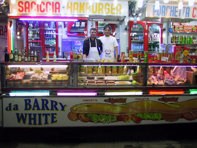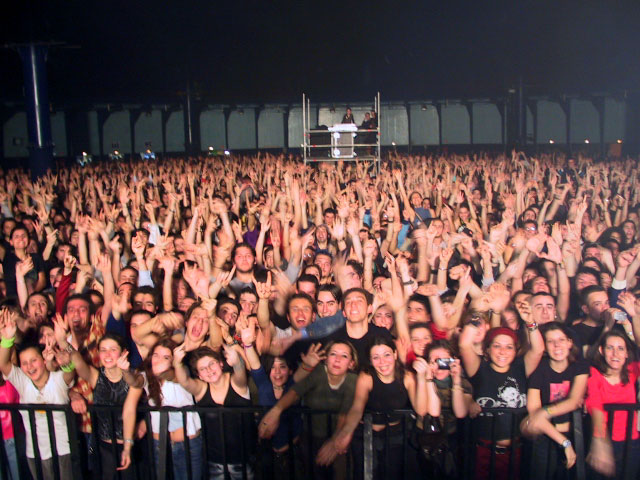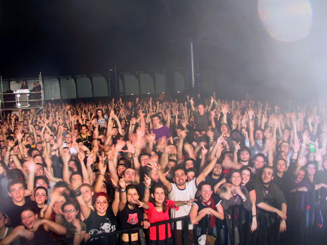 Uno in particolare ci incuriosisce "hot dog e panini .....da Barry White". Dobbiamo ancora farci l'abitudine a considerare i nostri concerti proprio come "quelli veri", quelli che andavamo a vedere da ragazzetti, quando la musica albergava nei nostri più irrealizzabili sogni. E adesso fa effetto guardare i ragazzi a coppie o in gruppo parlare tra loro camminando verso l'ingresso e sapere che sono lì per la tua, di musica. Scendiamo dal furgone e troviamo una grande eccitazione ad accoglierci. Pare infatti ci siano quattromila persone.