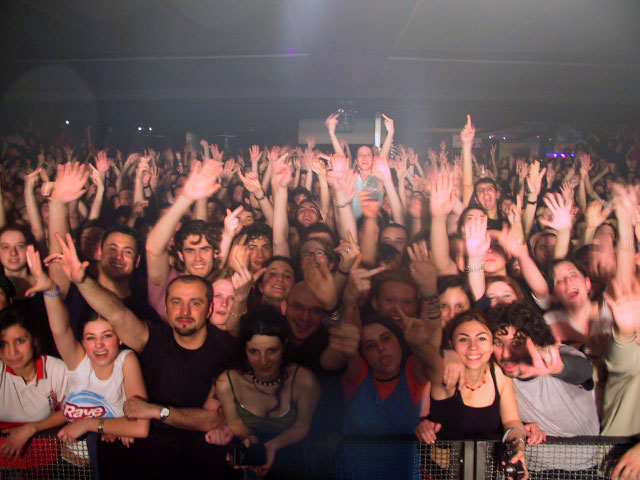 Avendo l'onore di chiudere la serata (dopo artisti del calibro di Royksopp, Timo Maas, i piemontesi-internazionali Feel Good Production, e gli apolidi Planet Funk) ci troviamo contemporaneamente nella malaugurata condizione di avere uno spazio di più di cinque metri fra la front-line di Samuel, Boosta, Max e la sezione ritmica persa sullo sfondo. E' una condizione che inibisce parecchio il groove, ma non si può fare altrimenti.Ci prepariamo a salire sul palco. Recentemente il Boosta si è messo in testa di arringare il resto della band nei camerini prima dello show con esortazioni del tipo: "questa notte ho fatto un sogno, eravamo insieme su 5 bighe d'oro, correvamo incontro al nostro destino, il destino era al centro della battaglia e ci tendeva le mani, stasera siamo arrivati qui per incontrarlo, è lui che ci desidera. Io lo sento, POTETE SENTIRLOOOOOOANCHEVOOIII?????,NON VI SENTO!! ,HO CHIESTO SE POTETE SENTIRLO COME LO STO SENTENDO IO!!!!!!!!!!!,????????????PERCHEEEE' ADESSO!!!!!!IO!!!!! VOGLIO!!!!!!!!!!CHE SALIATE SU QUEL CAZZO DI PALCO!!!!!!!!!!!!!!!!!!!!!!!!!!!!!!!!!!!!E VI PRENDIATE.......IL VOSTRO........POSTO.......NELL'OLIMPO.......DEGLI UOMINI!!!!!!!!VERIIIIIIII!!!!!!!!!!!!!!!!!V O G L I O S A P E R E C H E L O D E S I D E R A T E FATEMISENTIRECHELODESIDERATE!!!!A D E S S O O O O O OOOOOOOOOOO!!!!!!!!!!!!!!!!!!!!!! .... Usciamo dai camerini carichi anche se un tantino frastornati tra gli sguardi perplessi di tutti quelli che trovandosi vicino alle pareti di platica si sono sorbiti le urla lancinanti del nostro invasato tastierista. Il quale nell'eccitazione deve essersi anche fatto scappare un"e adesso tu vai e a quello con la cravatta gli rompiilcuuuloooooo!!!! rivolgendosi al nostro cantante. Peccato che i simpatici Planet Funk avessero il camerino di fianco al nostro!