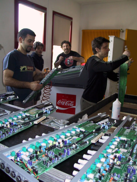 Appena arrivati ci troviamo dinanzi a un pool di tecnici capitanati da Cipo, allegramente intenti a pulire pezzo per pezzo il banco mixer che durante il trasbordo dalla Sardegna ha subito una vera e propria inondazione di olio della macchina del fumo (che non si pensi male: è quel macchinario che emette il fumo scenico sul palco...), colato misteriosamente attraverso i bauli nel camion. Attendendo il termine dei lavori di pulizia ne approfittiamo per fare un paio di interviste telefoniche (chi deve farle) o per rilassarci sotto un piacevole sole.