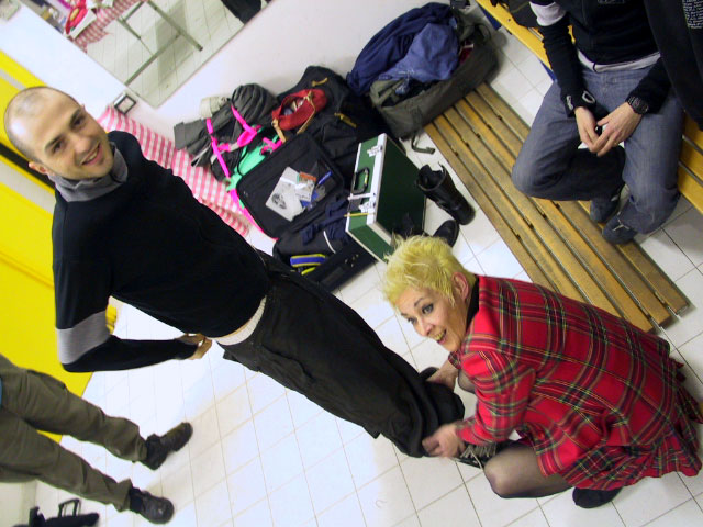 Intanto il tempo scorre, finiamo il sound-check e ci accorgiamo che nel frattempo sono arrivati i nostri nonni-punk Krisma, accompagnati da una ballotta di giovani amici con capigliatura rastamanna :questa sera i due biondo-criniti apriranno il nostro show come già per Pordenone.