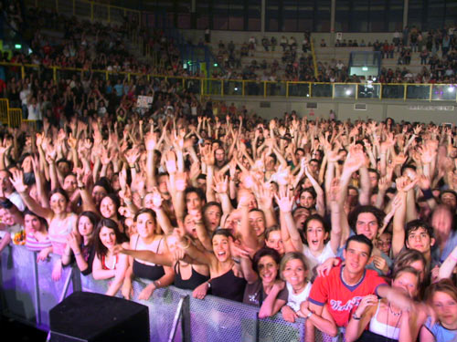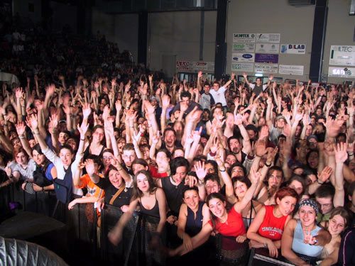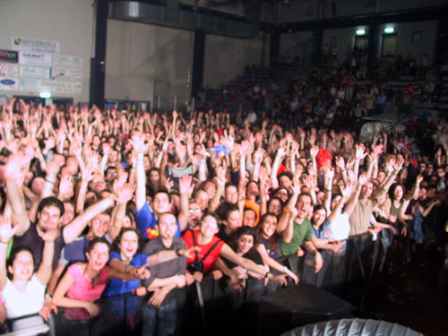 L'incamminamento verso il palco è piuttosto affaticato ma nel palazzetto ci sono più di tremila persone che chiamano a gran voce. L'acustica rimbomba e produce effetti inquietanti sui nostri riferimenti armonici, ma non ci scoraggiamo anche se in questi casi tutto è assai più faticoso e dando fondo alle ultime energie suoniamo un concerto che farà ballare dall'inizio alla fine tutto il palazzetto. Dal parterre fino alle sagomine su, su in alto sugli ultimi spalti.