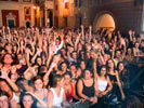 Piazza Mercurio si presta bene ad essere trasformata in un campo da calcetto e ci permettiamo tutto ciò che da bambini ci è sempre stato negato: giocare a pallone per la strada senza che nessun vigile ti rompa le palle. Del resto siamo gli artisti della serata. I camerini sono situati nelle antiche sale del municipio con tanto di soffitti affrescati statue e vecchi quadri. Davvero niente male anche la vista dal balcone del primo piano. Per la cena monopolizziamo insieme ai tecnici una saletta di una spartana trattoria del centro, cucina casalinga e fiaschi di vino.
